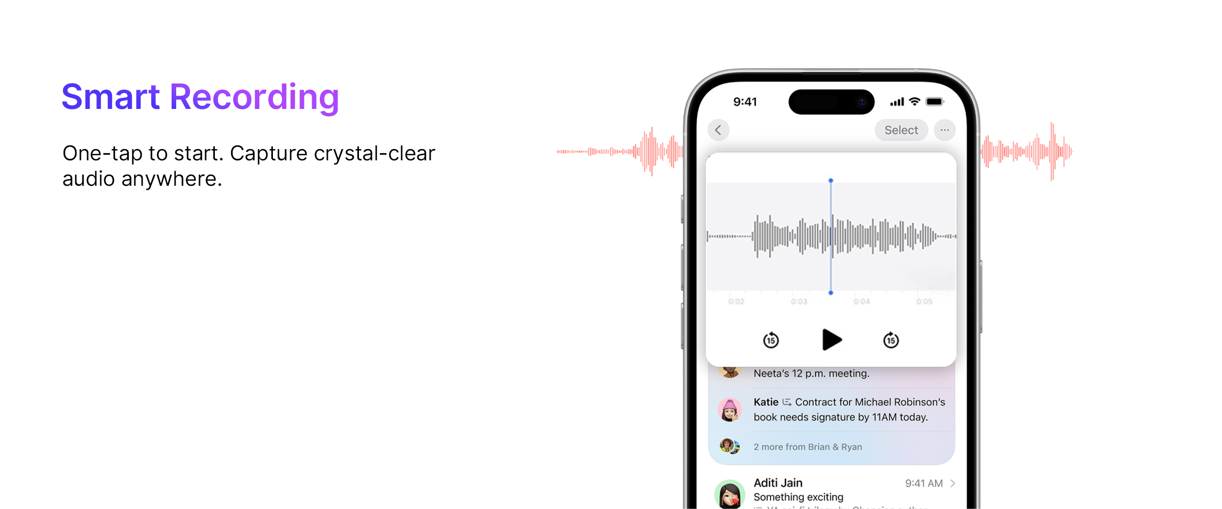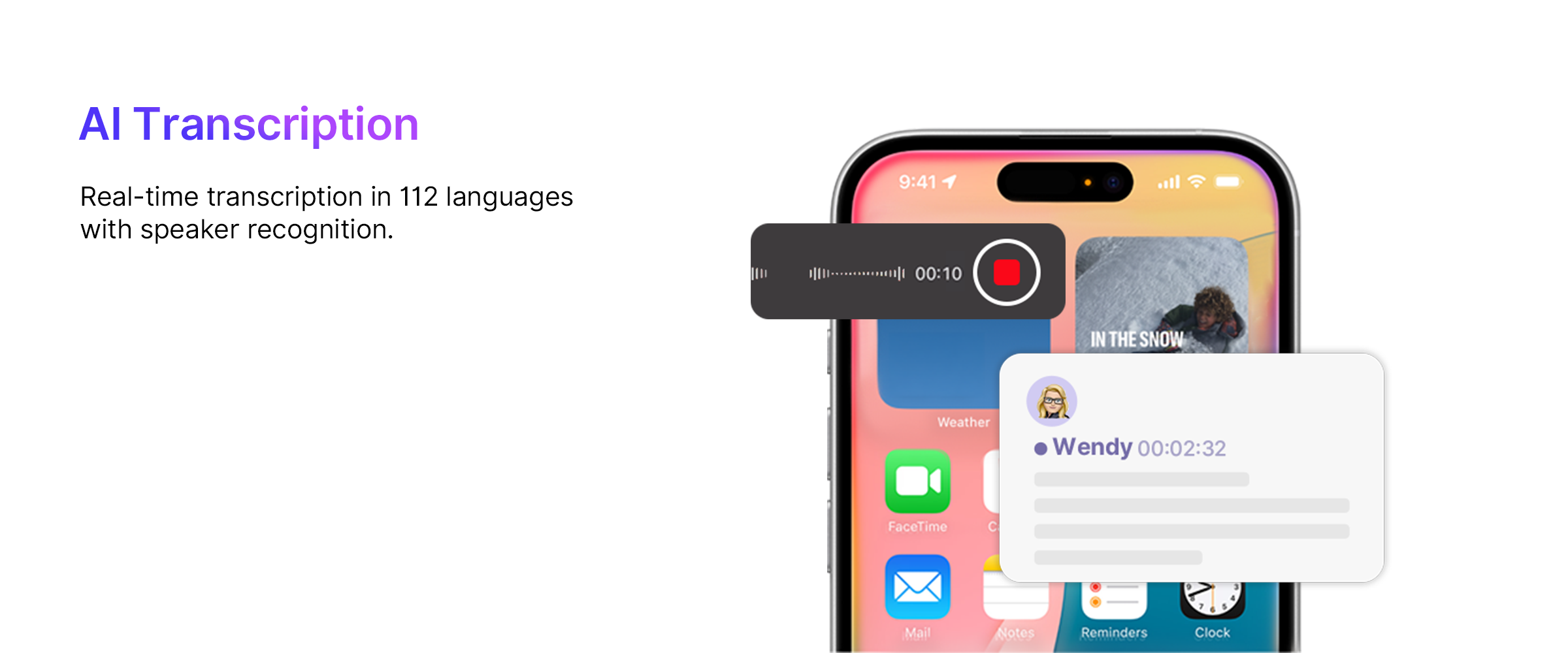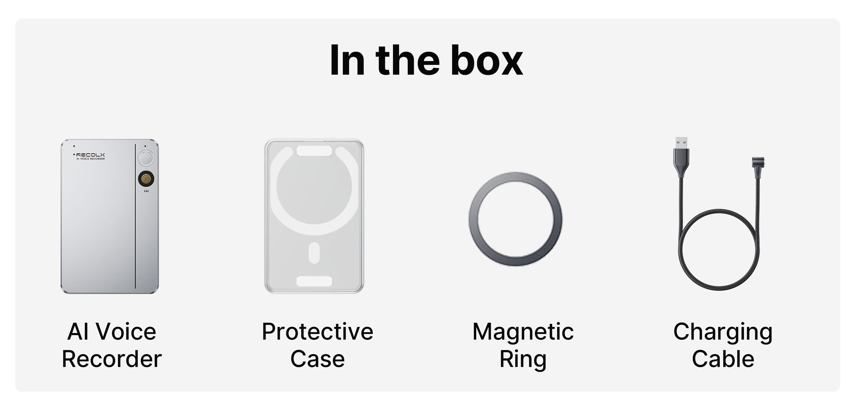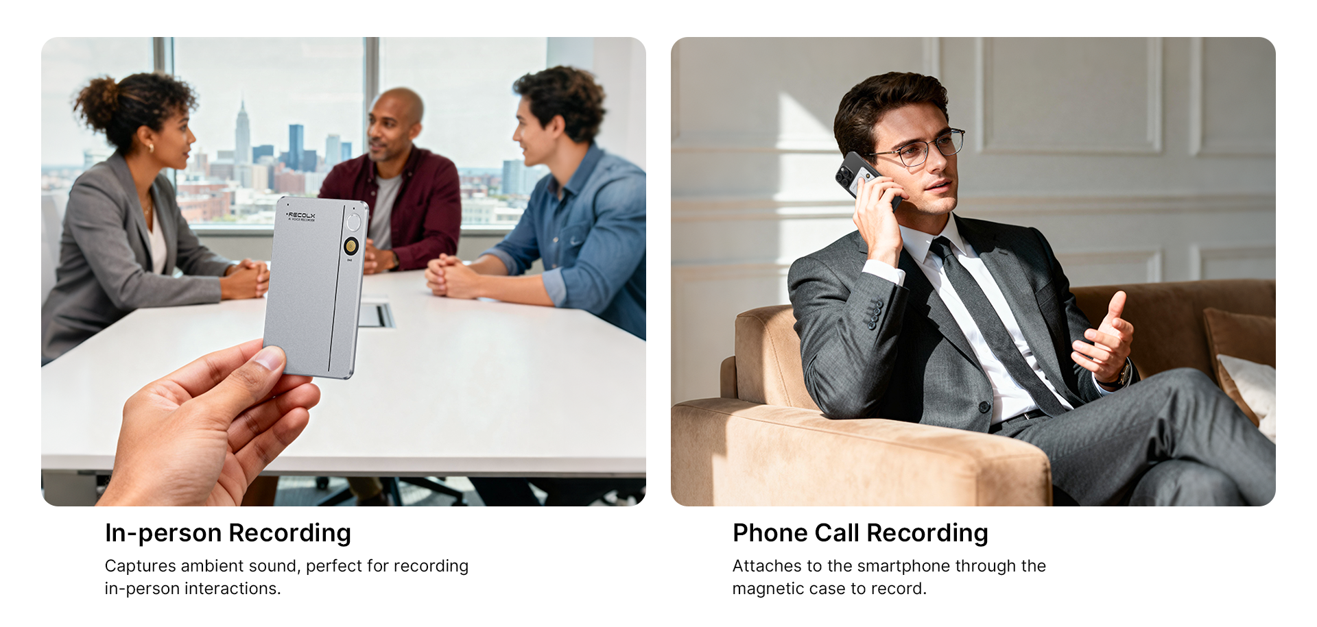Seamless recording for in-person meetings and calls. Attach to your phone for call recording, or place it on the table for meeting capture.