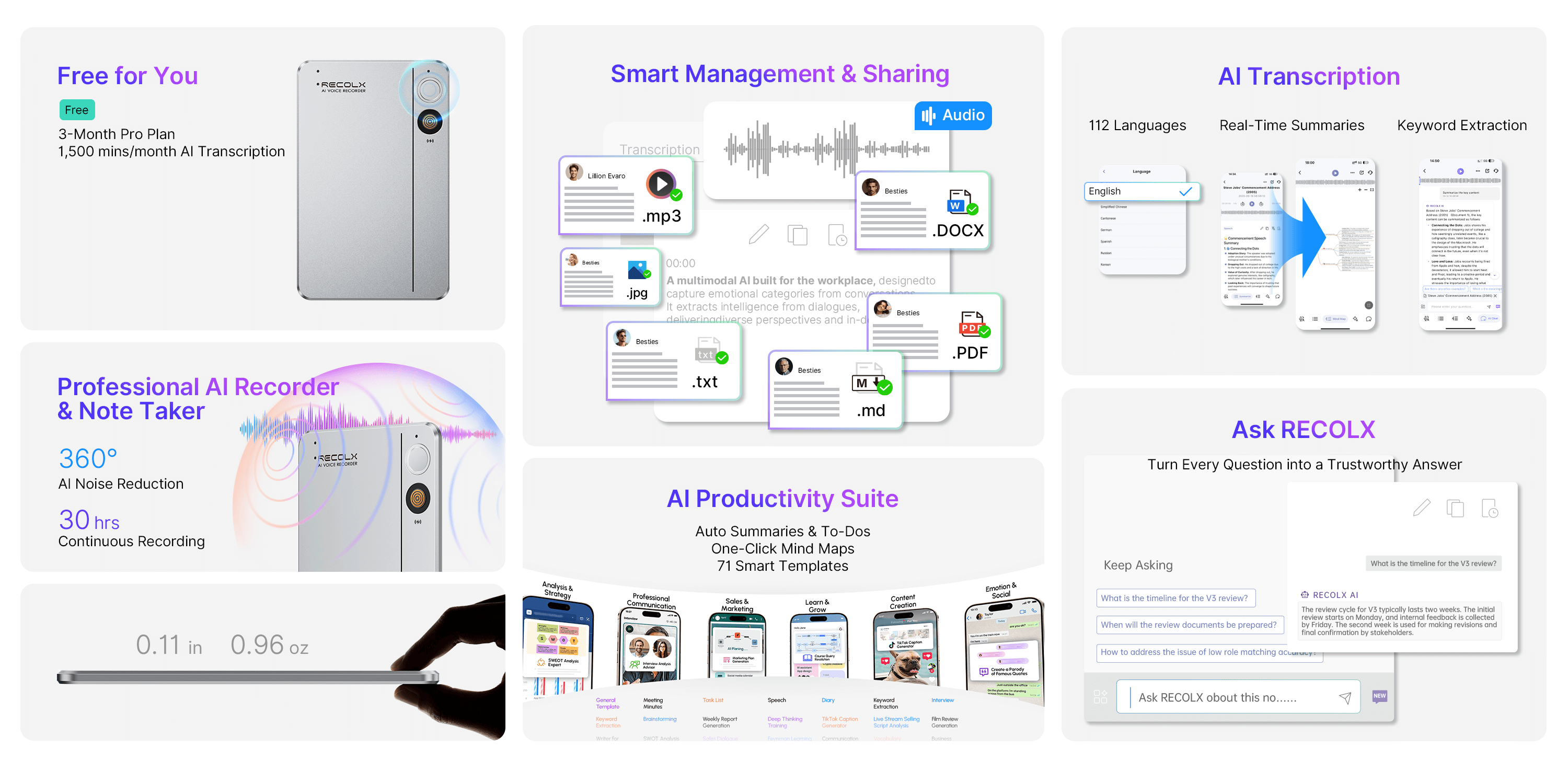 RECOLX Intelligence helps you capture ideas, understand context, and turn audio into insight.
